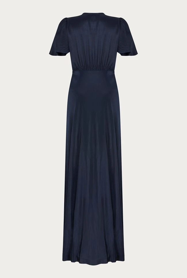 Vintage-like in silhouette and style, the Delphine in navy is a timeless design. Cut into a gentle V-neck, its button-through front gives way to a split to create movement whilst walking and to showcase your choice of shoes and finishes with a train hem. Gathered detail around the shoulders and under the bust adds to its feminine appeal. Made from heavy satin fabric obtained from sustainable sources, it is cut on the bias for a flattering fit. Delphine is an occasion-wear must-have and would make a perfect bridesmaid dress.