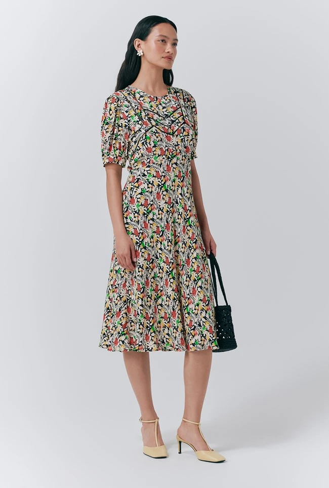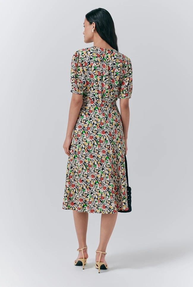 - Brighten your day with the Dotty Dress. Featuring a classic round neck and gentle puffed sleeves, this playful dress falls just below the knee for a flattering silhouette. Its vibrant, colorful print adds a joyful burst of energy, perfect for making every moment feel a little more special.