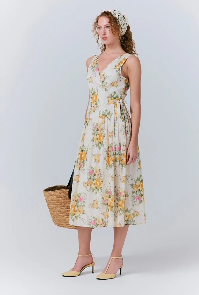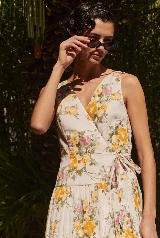 - We’ve combined the comfort and versatility of a wrap dress with the elegance of a drop waist to create Julia. Lined for practicality, this yellow floral midi wrap dress is sleeveless with a v-neck, and boasts both a timeless silhouette and a vintage appeal that lends itself to more formal occasions – think garden parties and weddings.