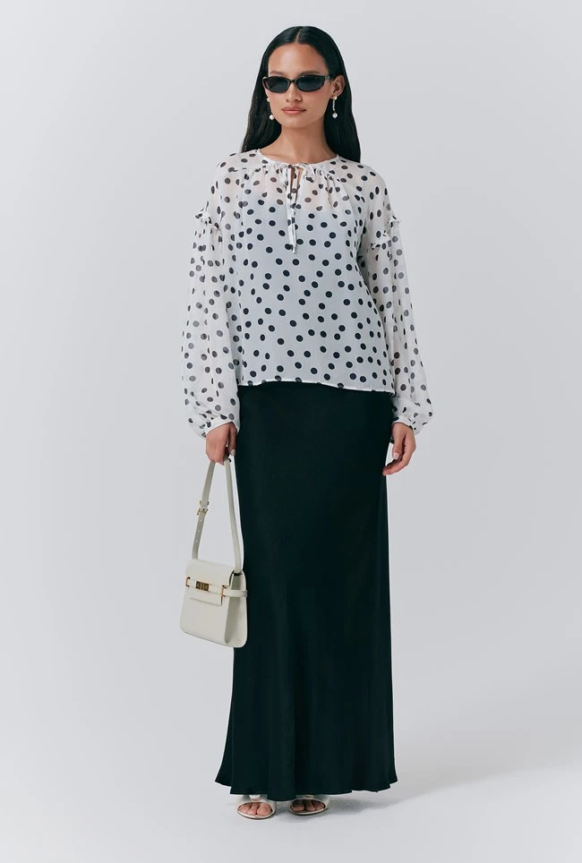 - Meet Karina, a chic blouse that’s as versatile as it is beautiful. Created in a lightweight sheer fabric with a classic polka dot print, this loose-fit style has voluminous sleeves, delicate frill detailing on the dropped shoulders and a tie at the neck. Try layering over your favourite slip dress for an elegant look, or tuck into high-waisted trousers for a more formal feel.