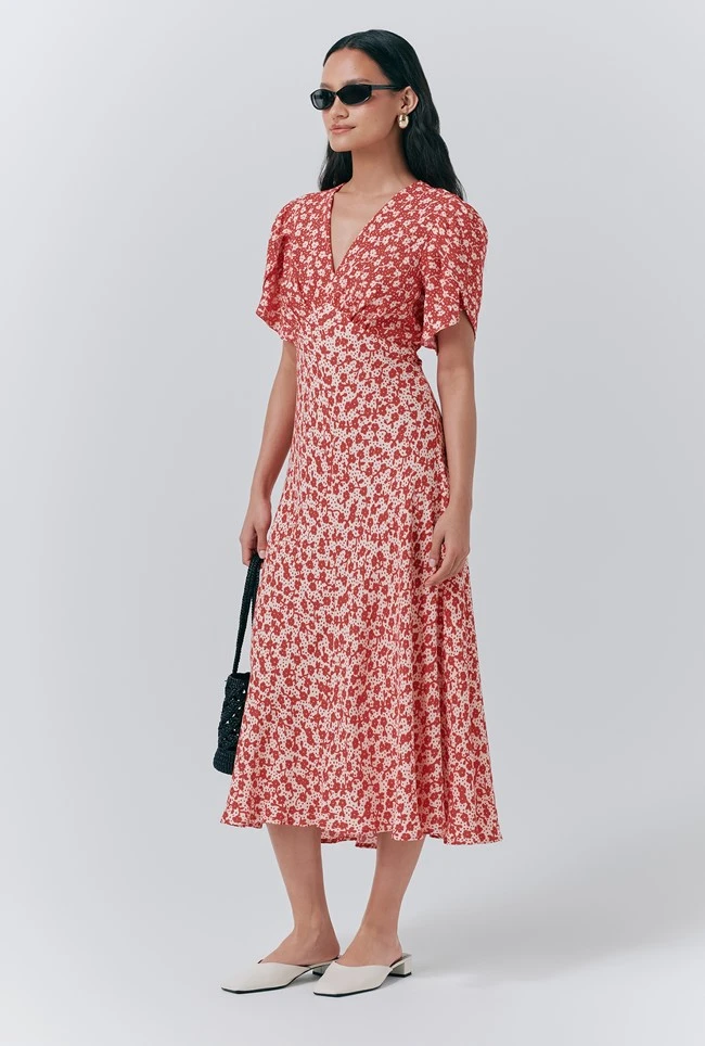 - We love the quiet impact of contrasting prints, it’s such a simple but effective way to add interest to a classic silhouette. Demonstrated perfectly here by Lulu, a red floral bias cut midi tea dress with a panelled empire waist, v-neck and soft petal sleeves. Dress her up with mules and chic accessories, or simply wear her with sandals on warm summer days.