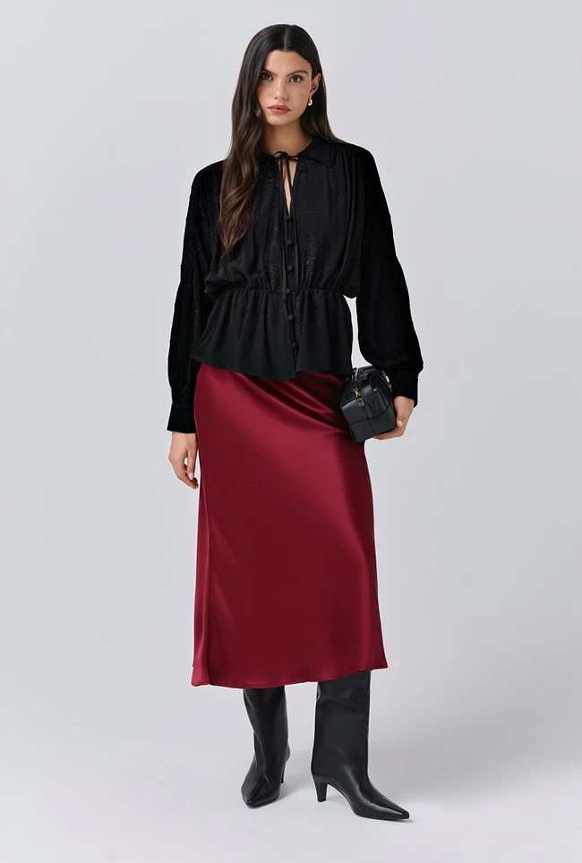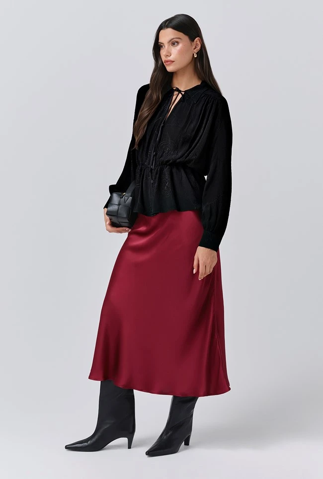- If you only have one skirt in your wardrobe, make it Luna. A true classic, this simple navy satin slip skirt is bias cut in a midi length and crafted in our signature satin, so it falls fluidly over the body to create a flattering, form-fitting silhouette. A subtly elasticated waistband ensures comfort. Dress up with a satin camisole and knitwear for this season.