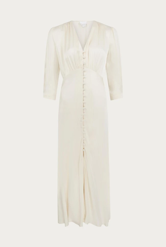 If you need a simple yet striking showstopper outfit, look no further than our Madison dress. Cut from sustainable EcoVero heavy satin, this vintage-inspired style features puffed shoulders, fabric covered buttons and three-quarter length sleeves. With a classic silhouette and front split detail, this ultra-feminine dress will endure season after season – plus it would also make the perfect bridesmaid’s dress.