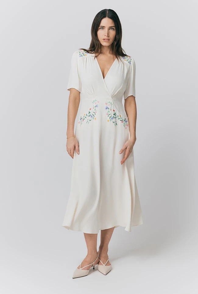 - For some sartorial sunshine, even when the weather isn’t looking so bright, look to Maeve. The centre piece of this vintage-inspired ivory white embroidered midi tea dress is the charming embroidery at the shoulders and waist. Featuring a wrap-style v-neck, a subtle A-line skirt, and flatteringly shirred under the bust, it’s a piece rich in classic details that will stand the test of time.