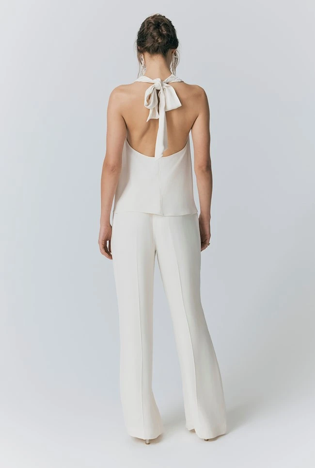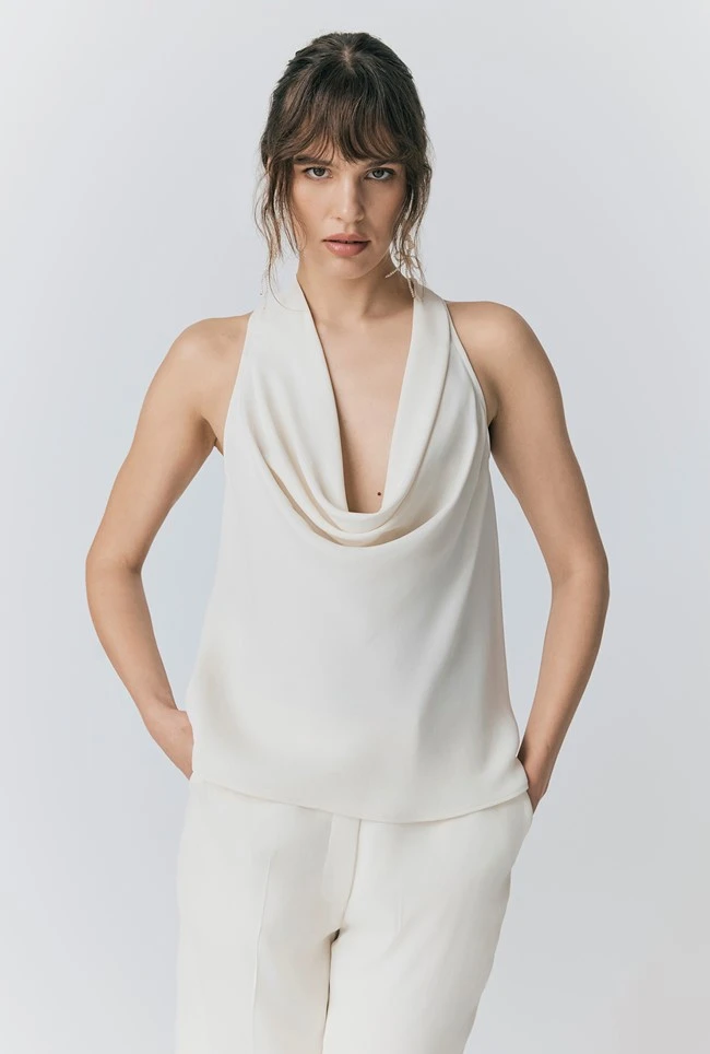 - Look to Sabine for an alternative bridal look or a showstopping occasion top. Adjustable, with a beautiful open back detail, Sabine is an ivory white satin cowl neck blouse that can be made higher or lower; she’s a showstopper whether paired with a skirt or trousers.